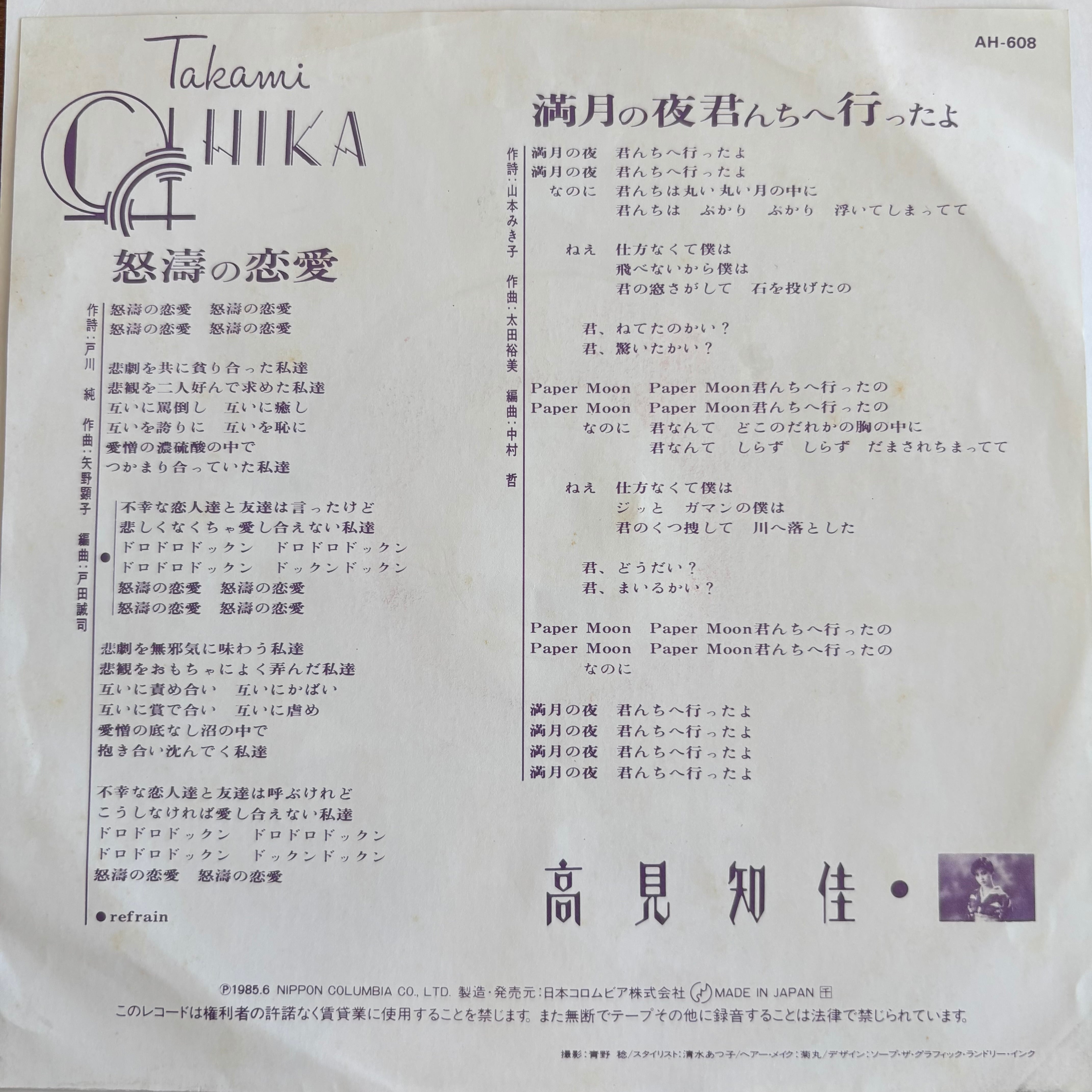 戸川純作詞、矢野顕子作曲、戸田誠司編曲のエレクトロファンク歌謡"怒濤の恋愛"と太田裕美のカバー"満月の夜君んちに行ったよ"をカップリング!