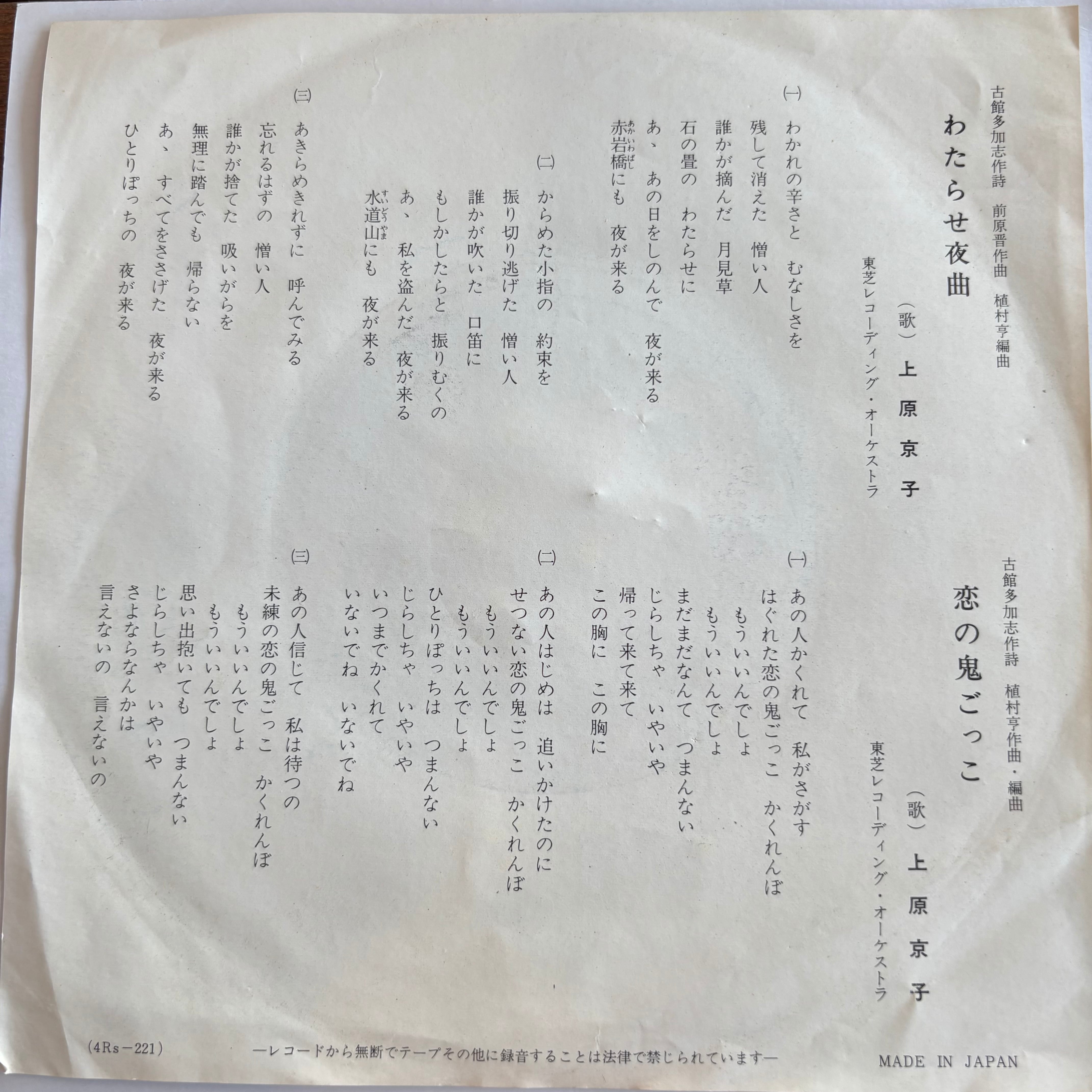 上原京子 / わたらせ夜曲 / 恋の鬼ごっこ