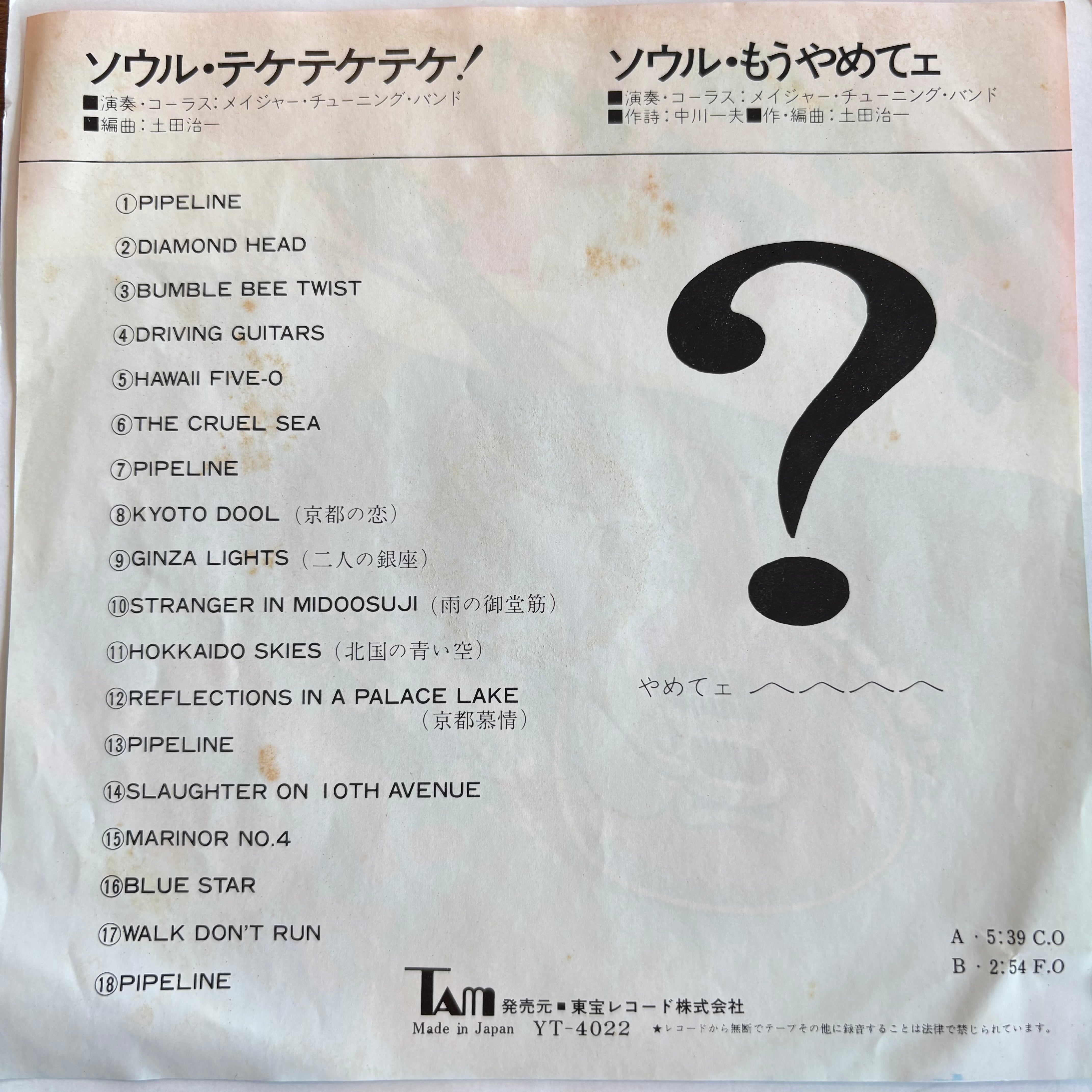 土田治一編曲。ベンチャーズの曲をディスコカバーしたメドレー作品"ソウル・テケテケテケ!"、B面は辺見マリのセクシー歌謡"経験"の『やめてぇ』のフレーズを使った"ソウル・もうやめてェ"をカップリング!