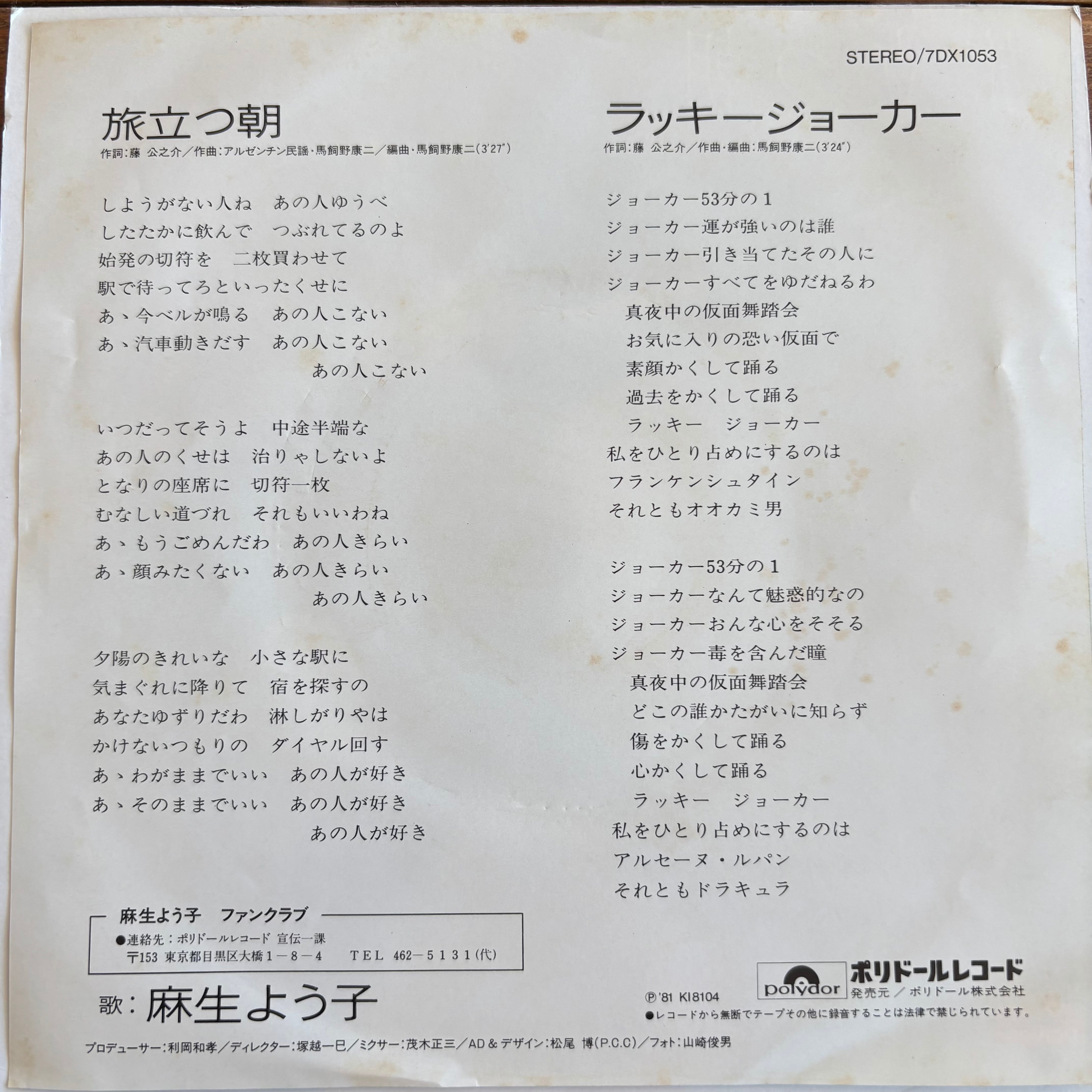 アルゼンチン民謡をアレンジした"旅立つ朝"とB面にはディスコ歌謡人気曲"ラッキージョーカー"を収録!