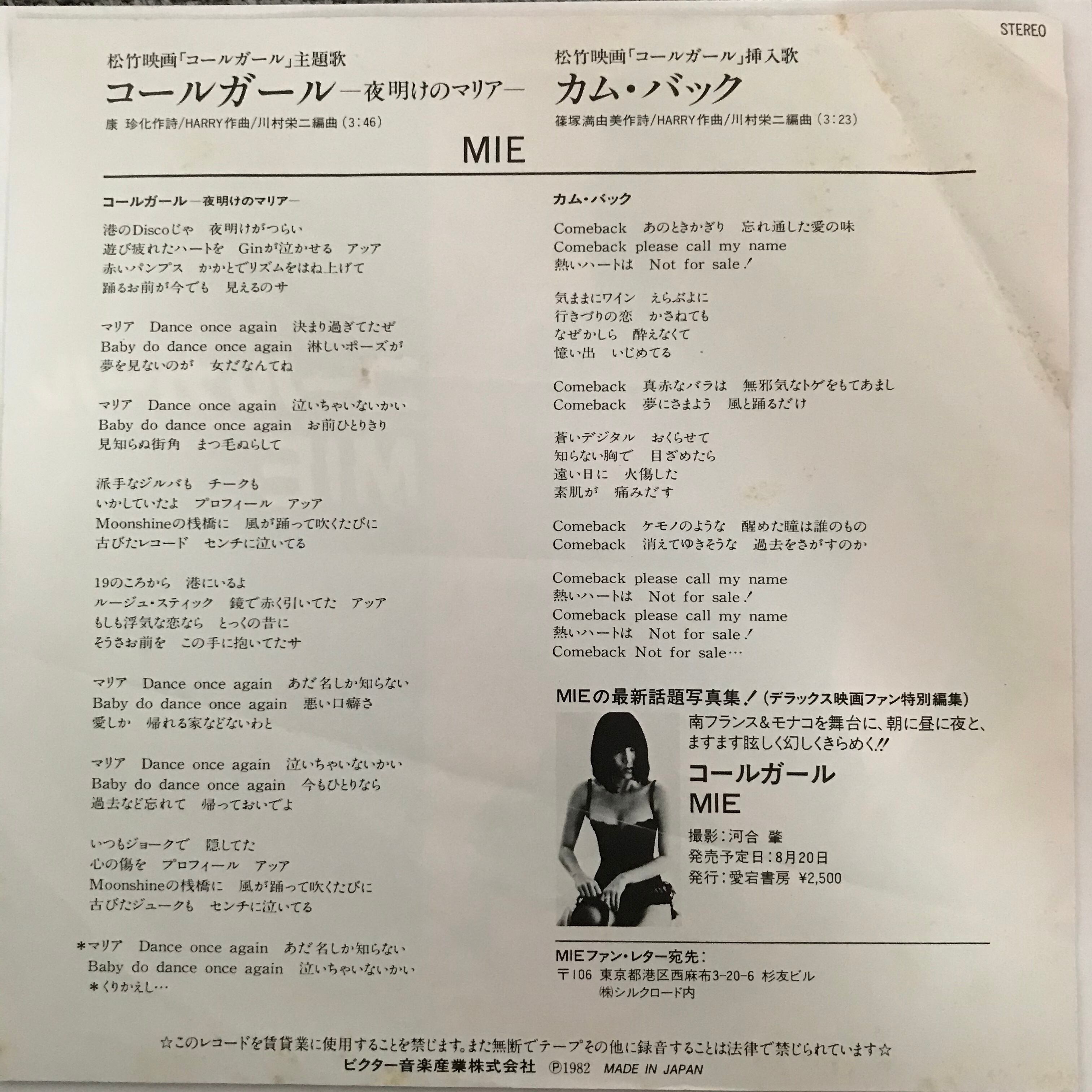 松竹映画『コールガール』主題歌。同じく挿入歌の"カム・バック"をカップリング。