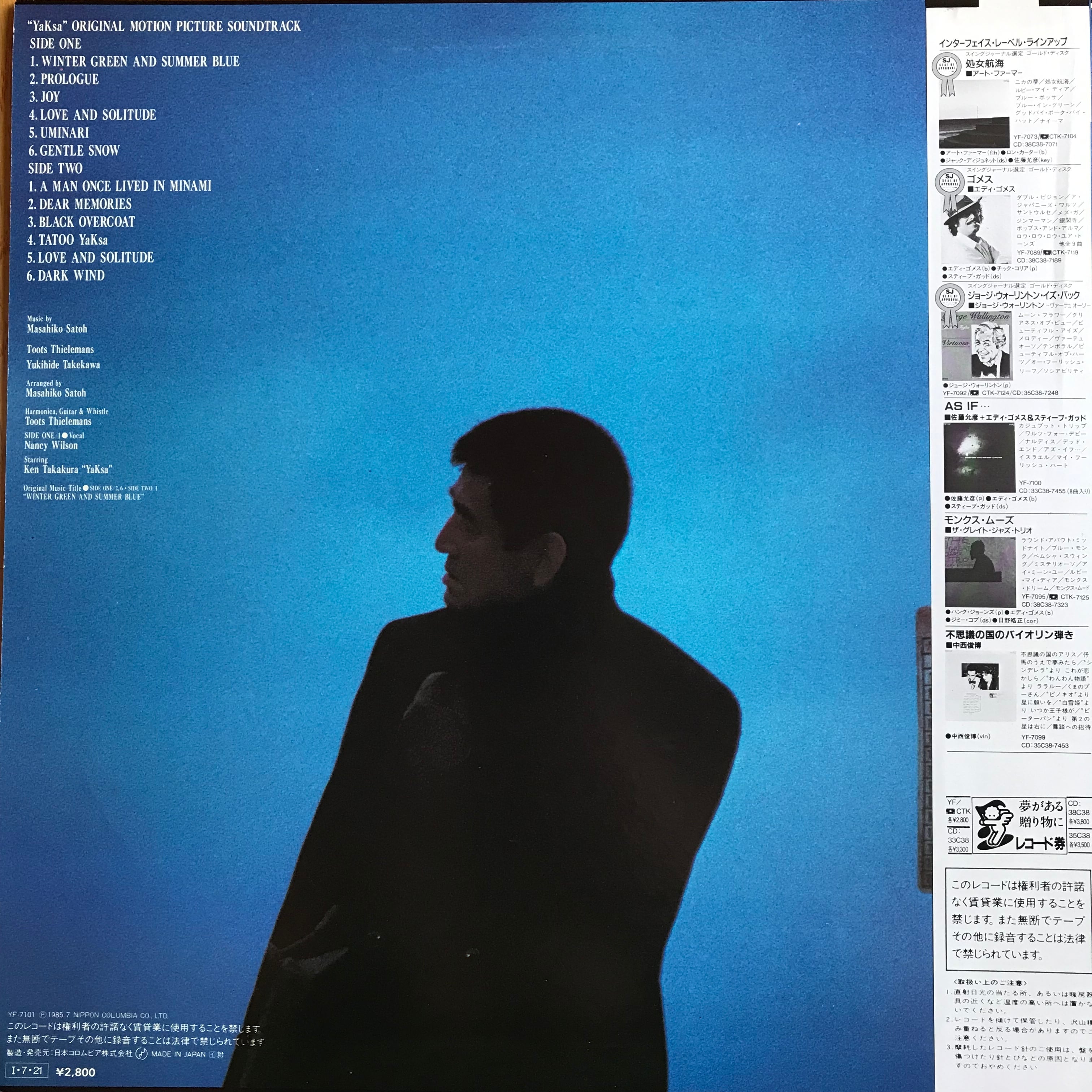 高倉健主演の東宝映画『夜叉』サウンドトラック。音楽はトゥーツ・シールマンスと佐藤允彦、主題歌はナンシー・ウィルソンが唄う"ウインター・グリーン、サマー・ブルー"!